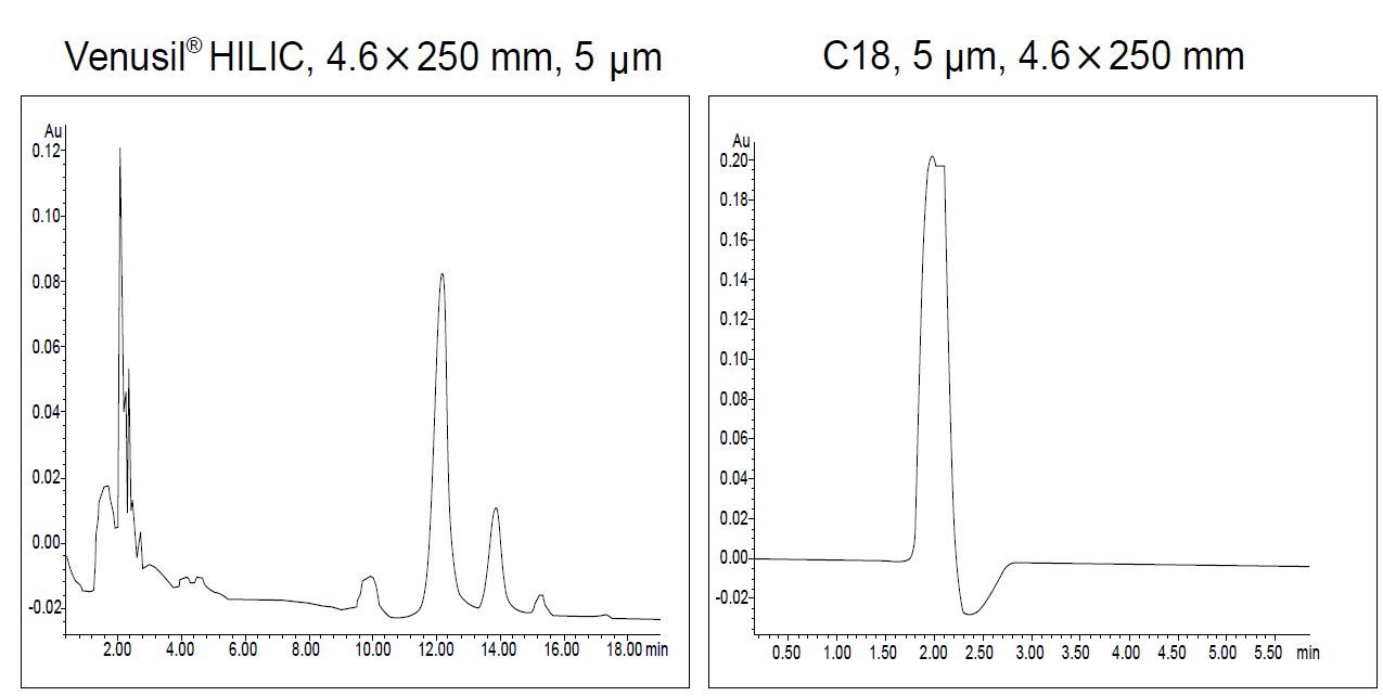 Venusil HILIC 色譜柱,鍵合相為中性的酰胺基團。在處理強極性化合物方面,Venusil HILIC 色譜柱比反相C18 色譜柱表現(xiàn)出更大的優(yōu)勢,利用親水作用色譜原理,可保留或分離強極性、水溶性堿性有機化合物。