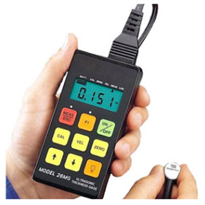 Panametrics-NDT 26MG 型超聲波測(cè)厚儀是一款價(jià)格低廉的超聲腐蝕測(cè)厚儀,用于內(nèi)部被腐蝕或被侵蝕的材料的精確測(cè)量。 它的重量輕(只有8.5 盎司,0.24 公斤) 、體積小、易于操作。厚度測(cè)量可以從壁的一側(cè)進(jìn)行,無需切開被測(cè)量部件。 26MG 提供多種實(shí)用測(cè)量功能。譬如探頭類型自動(dòng)識(shí)別功能;快速*小值模式,即可以在每秒20次的快速掃描下保持顯示*小讀數(shù);凍結(jié)模式,即可以凍結(jié)顯示來捕捉重要的厚度數(shù)據(jù)。一個(gè)帶有電致發(fā)光背光的液晶顯示器,用大而醒目的數(shù)字來顯示測(cè)量到的厚度。 26MG 型超聲測(cè)厚儀**將操作簡(jiǎn)單、價(jià)格低廉和性能**三大優(yōu)點(diǎn)融為一體。