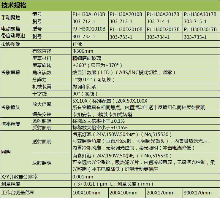 PJ-H30系列投影儀具有(3+0.02L)μm的高測(cè)量精度;可通過手動(dòng)或電動(dòng)上、