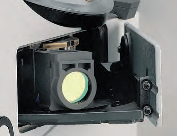 處于開放狀態(tài)的6位熒光轉盤。通過按鈕可以輕松地將熒光濾塊轉盤打開,并安裝或拆卸熒光濾塊。