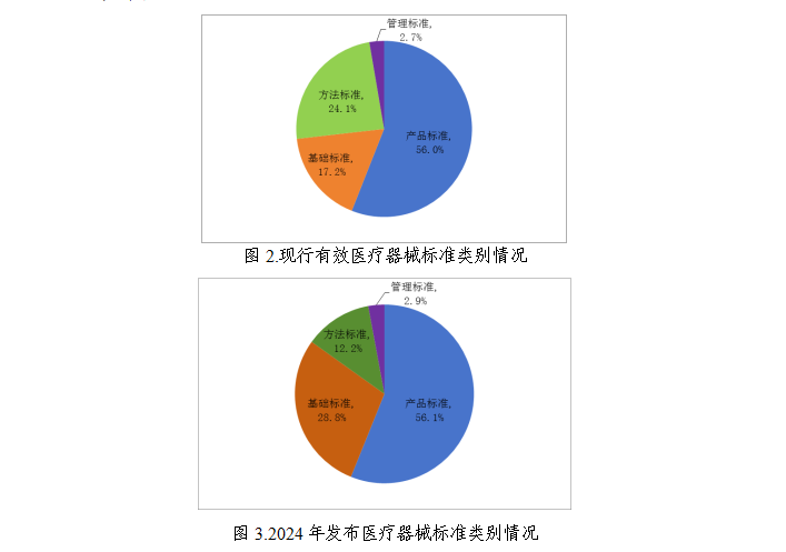 2.標(biāo)準(zhǔn)體系結(jié)構(gòu)更加完善。按標(biāo)準(zhǔn)規(guī)范對象統(tǒng)計,現(xiàn)行有效醫(yī)療器械標(biāo)準(zhǔn)中基礎(chǔ)標(biāo)準(zhǔn)349項(占比17.2%);管理標(biāo)準(zhǔn)54項(占比2.7%);方法標(biāo)準(zhǔn)488項(占比24.1%);產(chǎn)品標(biāo)準(zhǔn)1132項(占比56.0%)(見圖2)。2024年發(fā)布基礎(chǔ)標(biāo)準(zhǔn)40項(占比28.8%);管理標(biāo)準(zhǔn)4項(占比2.9%);方法標(biāo)準(zhǔn)17項(占比12.2%);產(chǎn)品標(biāo)準(zhǔn)78項(占比56.1%)(見圖3)。